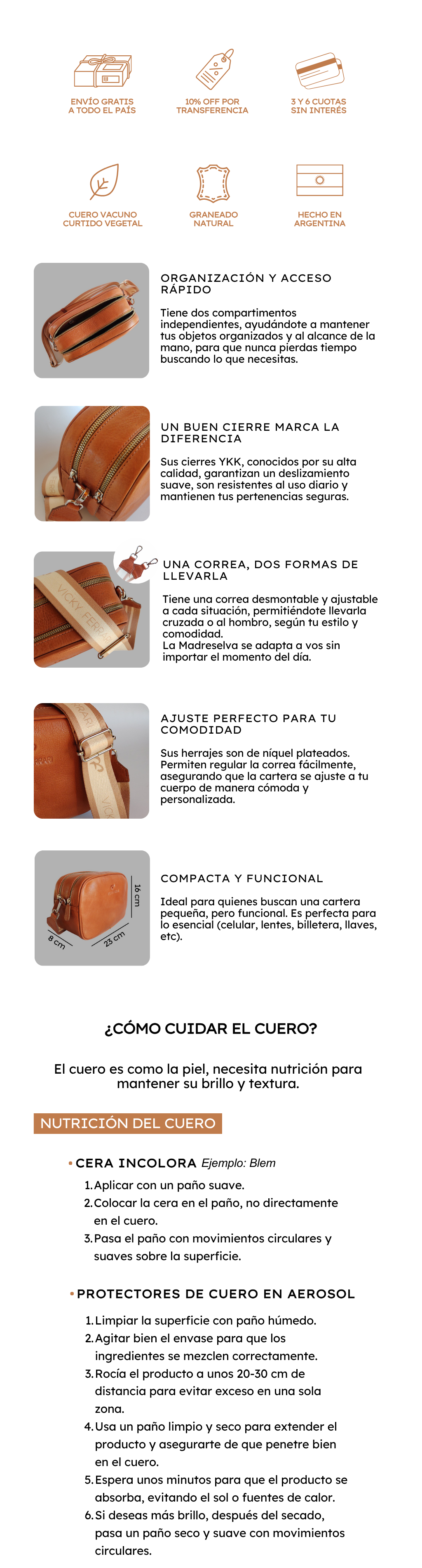 Cada pieza que fabricamos es única, con detalles que reflejan su proceso artesanal y el carácter natural del cuero. Por eso, pueden existir sutiles variaciones en el color y la textura, haciendo que cada cartera sea especial y exclusiva. En Vicky Ferrari, valoramos estas diferencias como parte de nuestra esencia, destacando la calidad, autenticidad y un diseño que te acompañará por años ✨
